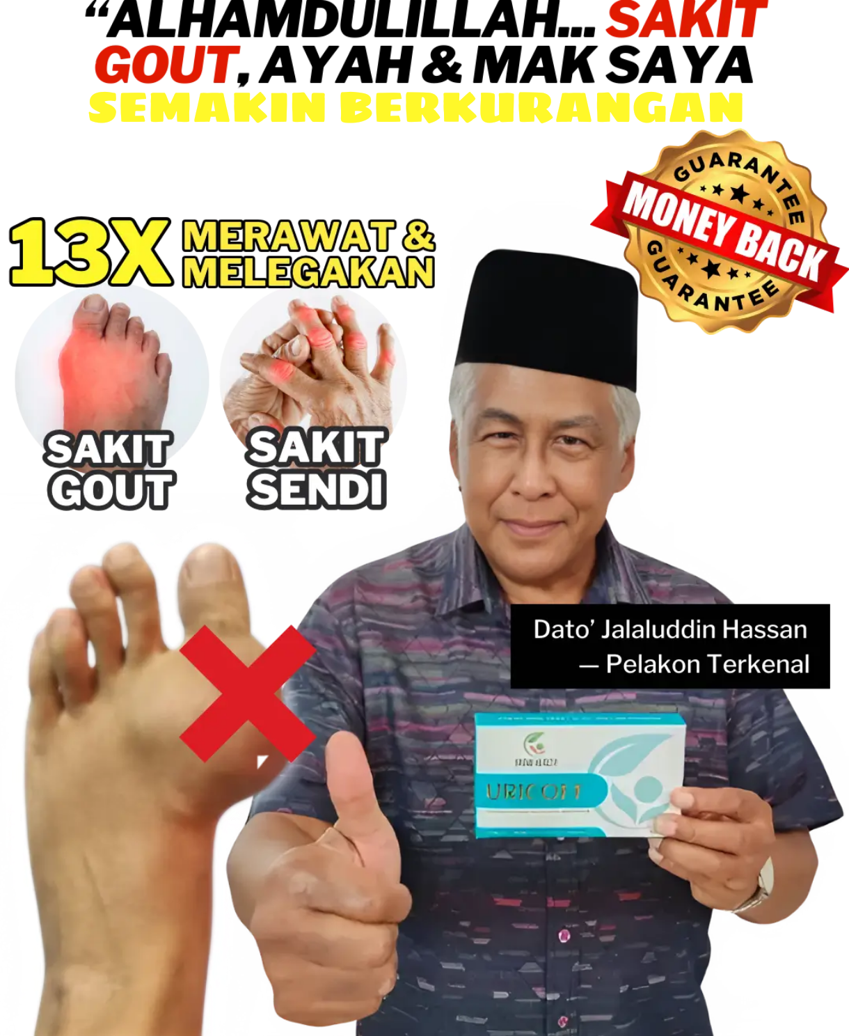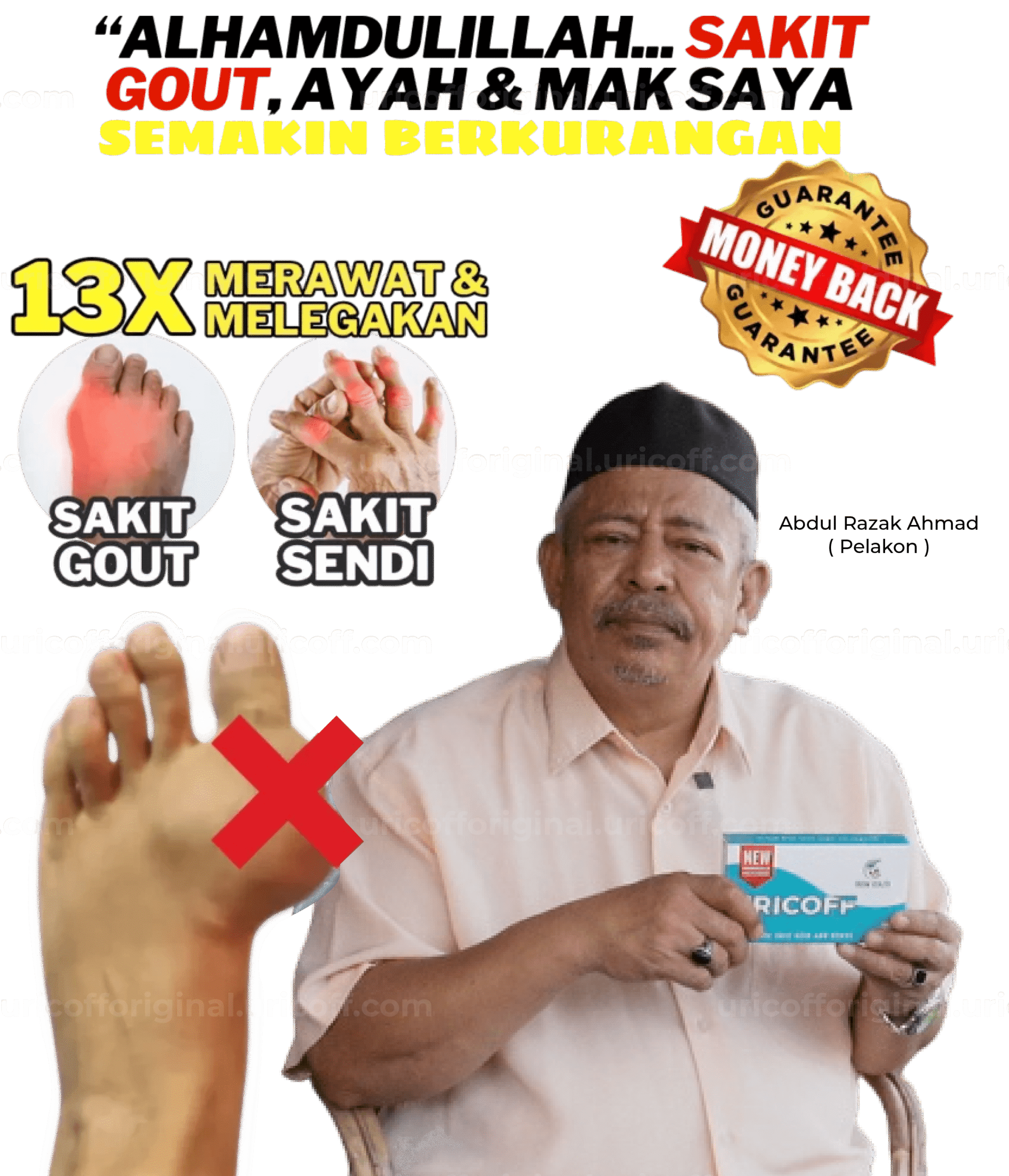 KETIGA : Anda bagi peluang untuk cuba URICOFF sekarang. Amalkan setiap hari, sampai anda dapat rasa sendiri yang GOUT makin sihat. Tiada lagi serangan MENGEJUT. Tiada lagi sakit sendi. Kebas-kebas pun hilang. Produk selamat, berkesan.